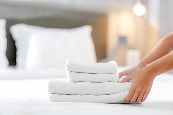 宿泊後のルームクリーニング業務です。客室、水回り、共用部などを常に清潔で快適に保ち、UBIQS運営の中で重要な商品作成を担っています。